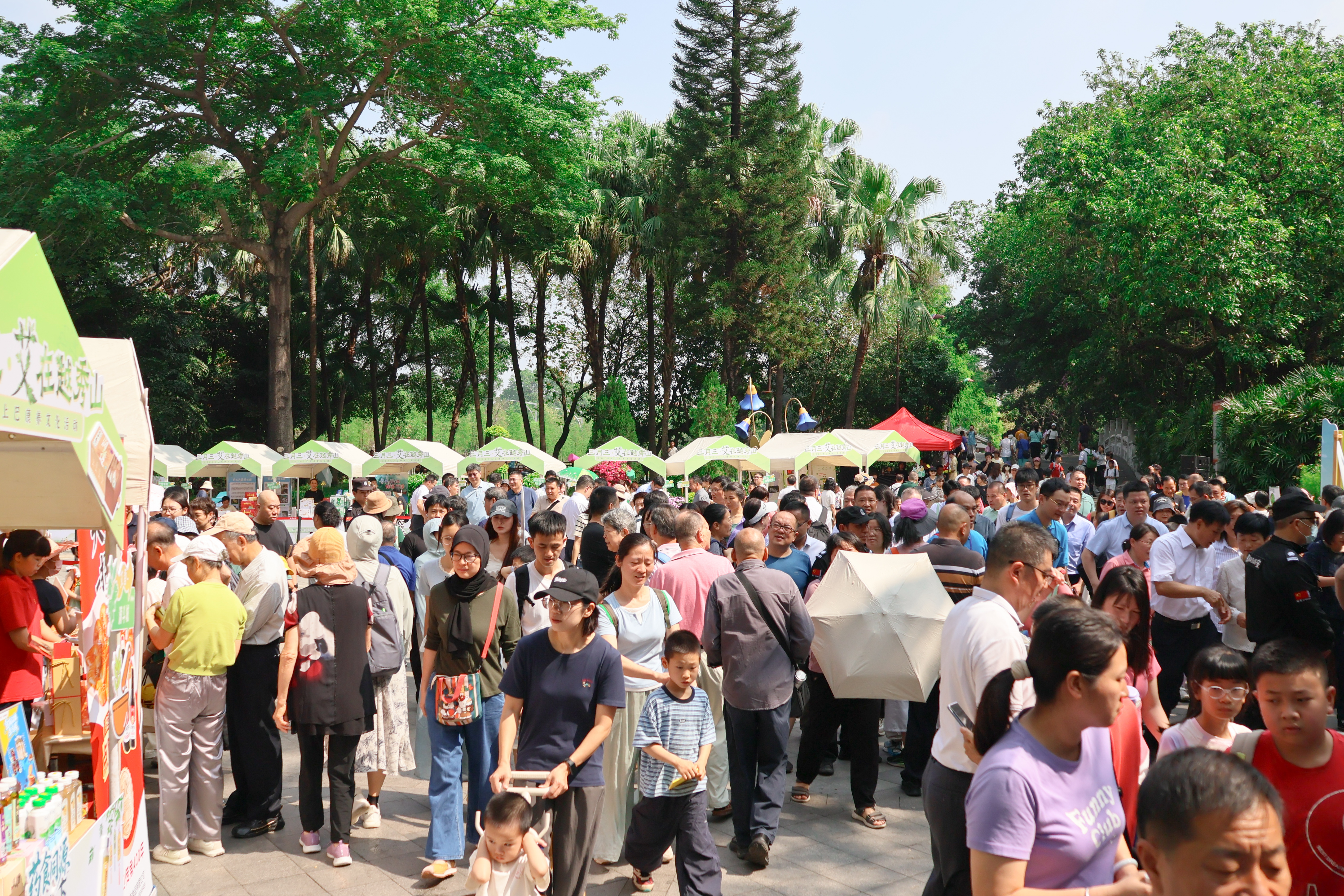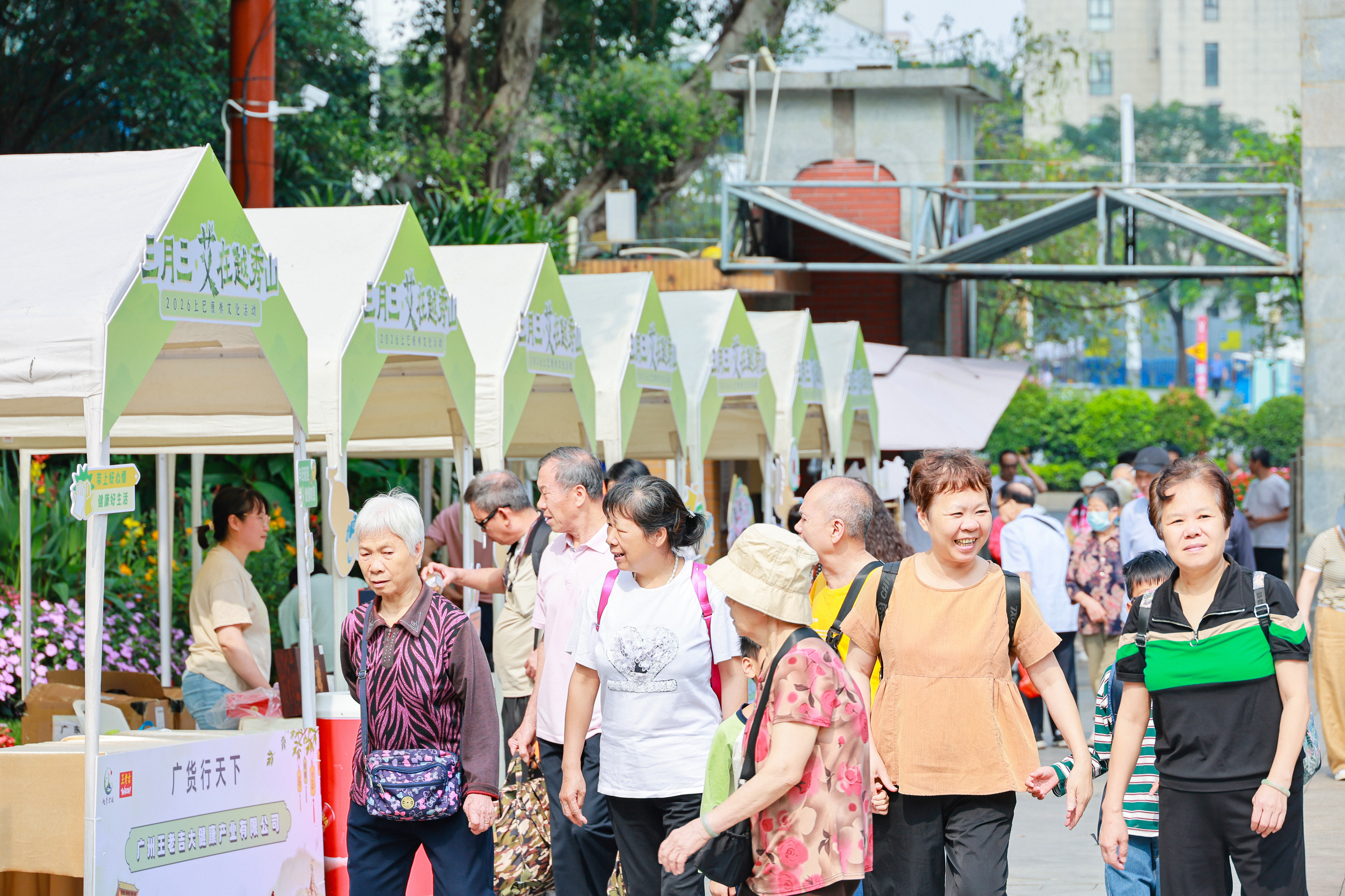 循着艾香漫步,艾主题打卡点、艾文化装置沿路铺展。公园正门广场及南秀花苑路段,“广货行天下”“粤林+”集市重磅亮相,23个摊位汇集广府优品、林特产品与艾产品创意文创,以公园场景赋能本土好物推广,助力消费提振与广州经济发展。