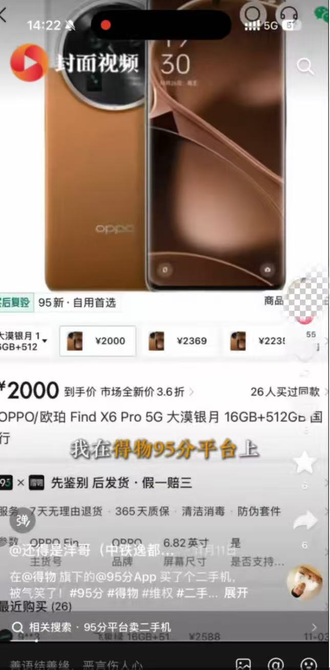 “前段时间,部门的小伙伴要买一个工作手机,我在得物95分APP上,看到了这款OPPO手机,当时的形容是只有前盖和后盖换过,其他功能良好,并且电池的健康度是95%到100%。”@还得是洋哥表示,“我觉得性价比非常高,就买了”